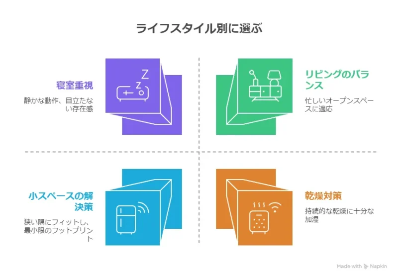 加湿量だの畳数だのを真剣に比べる前に、まず“買ってから困るポイント”を先につぶしておくと、選びが一気にラクになります。