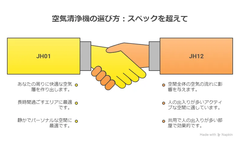クラウディック空気清浄機 JH01とJH12の違いは、単純に「どちらが上か」で決まるものではありません。